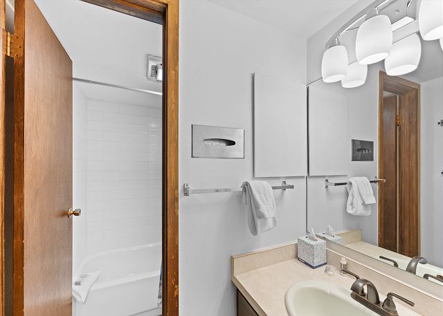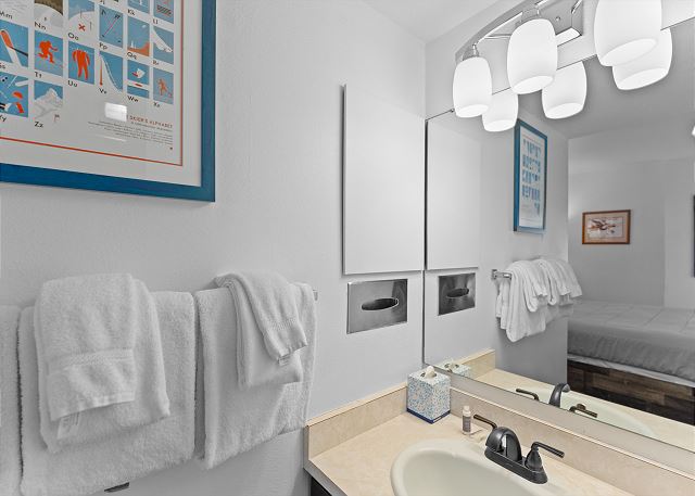 The full size kitchen is fully stocked with all the essential cookware and tableware to make a meal away from home and features stainless steel appliances. The dining area comfortably seats seven with four additional seats at the breakfast bar. The first of two full bathrooms is just off the main living area and features a single sink vanity and a shower/tub combination. All bathrooms are stocked with towels and an initial supply of toiletries.