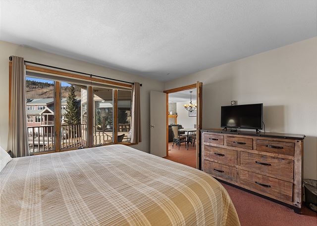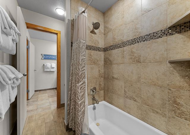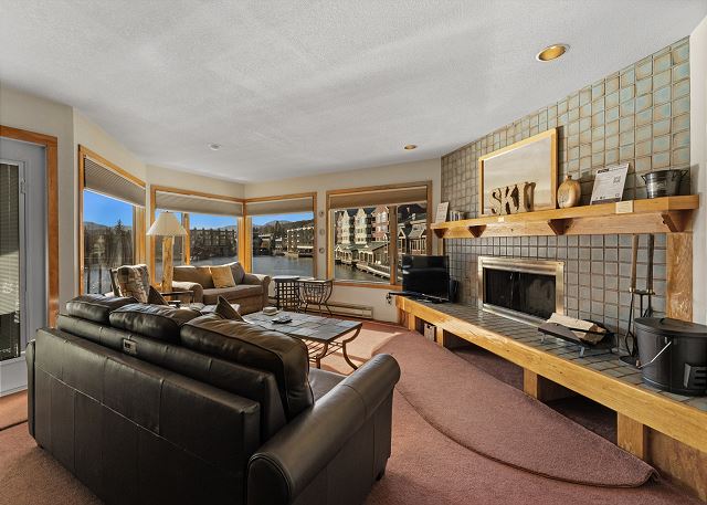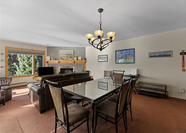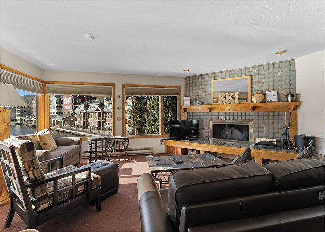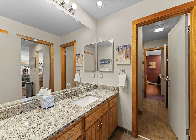 The living area has a flat screen TV next to a beautiful wood-burning fireplace. There is a Playstation 3 that will play Blu-rays and DVDs. There is a queen-sized sleeper sofa and the oversized chair pulls out into a single bed. Extra sheets and blankets are in a closet. The private balcony is just off the living area, and offers amazing views of Keystone Lake. In the winter you overlook ice-skating and hockey, and during the summer you'll see the sparkling water with people canoeing and enjoying paddle boats.