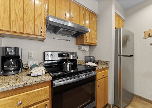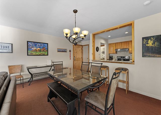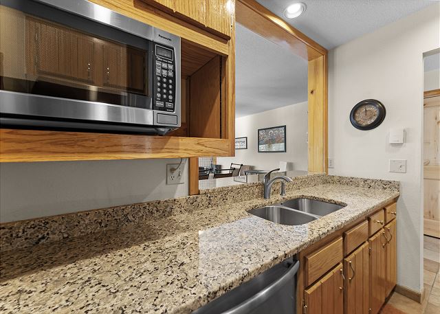 This condo features a full-sized kitchen that is stocked with all the essential cookware and tableware to make a meal away from home and features granite countertops. The dining area comfortably seats six people and there are two additional seats at the breakfast bar.