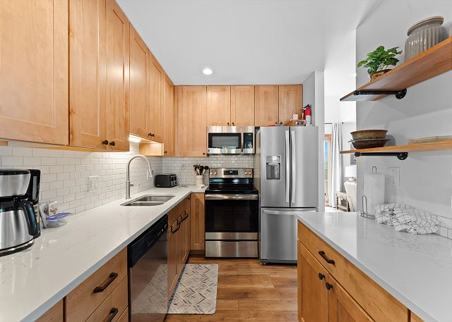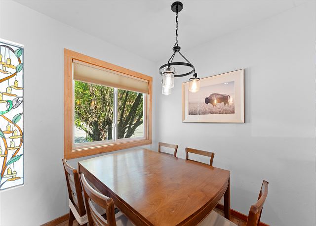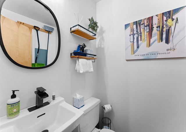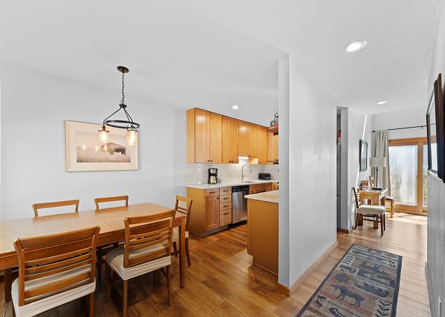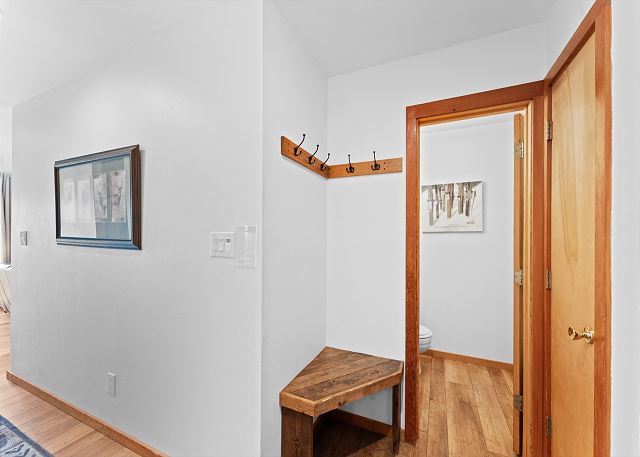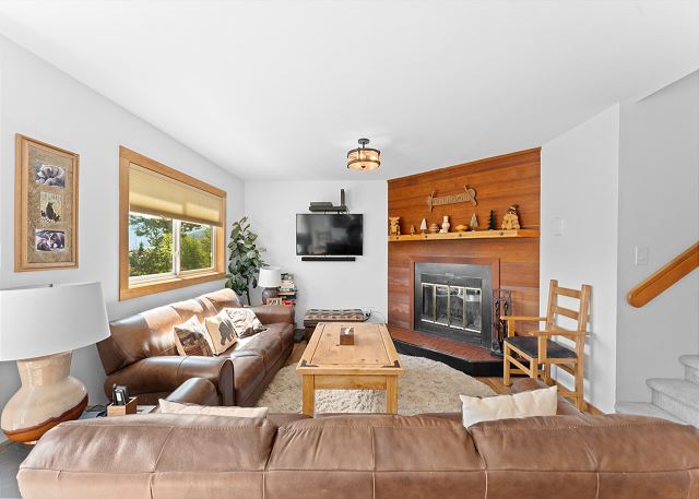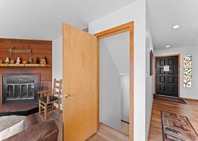 The main floor welcomes you with a fully equipped kitchen featuring stainless steel appliances and upgraded countertops. The adjacent dining area seats up to 5, with two extensions in the front hall closet and extra chairs in the living room. A convenient half bath is located near the entryway. Relax in the cozy living room with a wood-burning fireplace, TV, and a selection of books and games, or step out onto the private balcony to soak in the gorgeous mountain views.