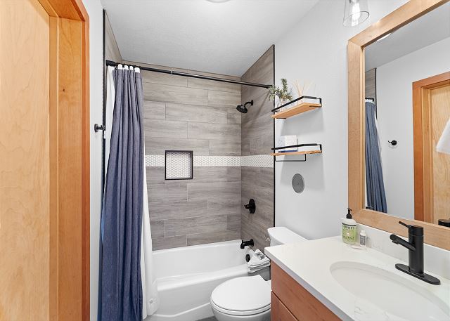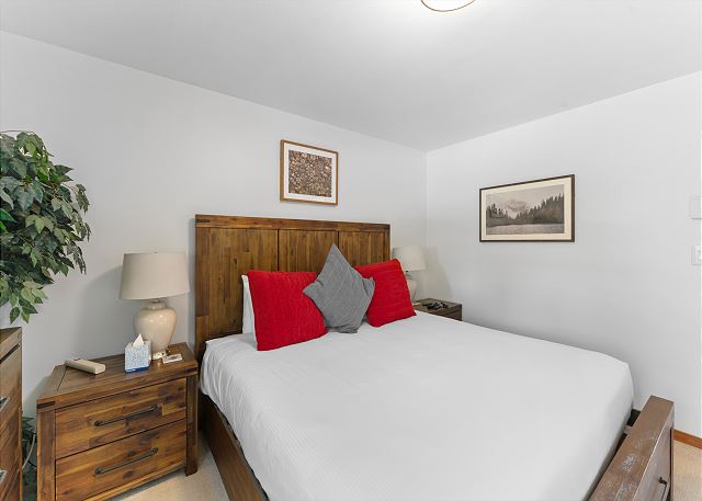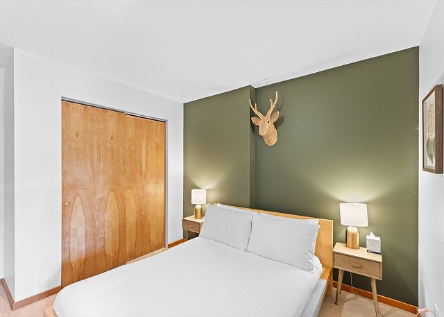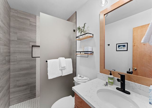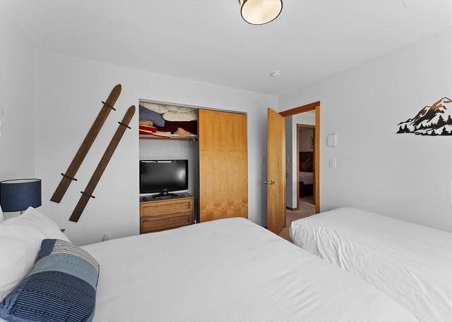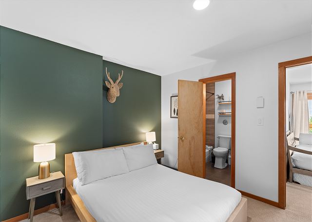 Head downstairs to find a second spacious living area with plenty of seating, another TV, and access to a large deck with outdoor furniture—perfect for enjoying the crisp mountain air. This level also includes a twin bed, a full guest bathroom, and a guest bedroom with a queen bed and private washer and dryer in the closet. The guest bedroom offers direct en suite access to the bathroom, providing privacy and convenience.